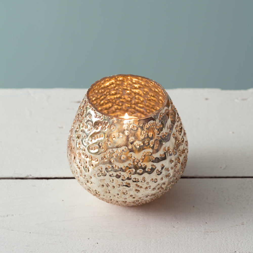 Transform your living space with this stunning shimmering votive holder that effortlessly adds a touch of sparkle to your home decor. Its unique design, featuring a textured exterior on gold mercury glass, ensures that it stands out as a distinctive piece in any room.