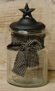 The jar features a distinctive star-shape on top of the lid along with a black homespun bow that adds a touch of whimsy and rustic charm, making it a standout piece in any setting. Its versatile design allows it to be used in various settings, whether in the kitchen for dry goods, the bathroom for bath salts, or as a decorative element in the living room. This 6.5â jar makes it practical for everyday use and easily incorporated into various decor styles, from farmhouse to shabby chic.