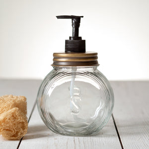 4.5" wide and 6.5" high including pump. Add an urban touch to the kitchen or bathroom with this popular soap dispenser. Clear glass with a brass lid.
