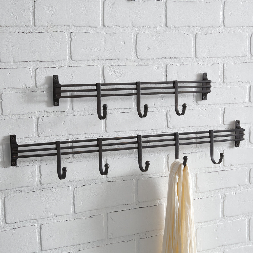 Practical and stylish, these coat racks can be placed on any wall where extra storage is needed. Each features a sleek, modern design. This item is fashioned from iron. To hang, use its four screw holes. The large measures 29.5''W x 3.5''D x 5''H, and the small measures 19.5''W x 3.5''D x 5''H. Measurements: Largest is 29.5''W x 3.5''D x 5''H