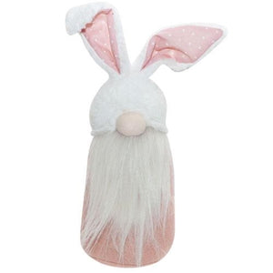Standing Pink Gnome with Bunny Ears is a gnome with a stuffed pink body and white bunny ears. Gnome is perfect for spring and Easter decorating and he is further accented by a round peach nose and long white beard. Gnome looks great on a wooden riser, stool, or tucked into a basket.
